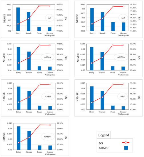 At first glance, it is obvious that in all seven models, the NRMSE values have a decreasing trend, and NS values have an increasing trend at the stations. This indicates that the Bobry and Sieradz stations have lower prediction accuracies than the Poznań and Gorzow Wielkopolski stations. As a matter of fact, predictions offered by the models improve as we proceed downstream along the catchment area.