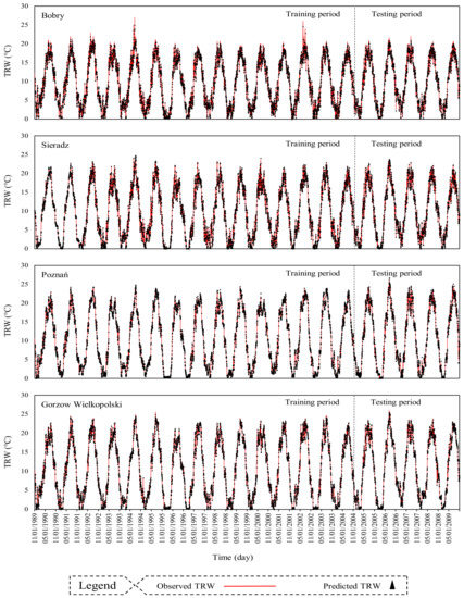 In the case of the Warta River, which constitutes the object of study, better prediction results for TRW were obtained for the middle and lower sections of its course (for the Poznań and Gorzow Wielkopolski water gauges), and slightly worse results were obtained for the water gauges located along the upper course (Bobry and Sieradz). Differences in the effectiveness of the prediction models may result from the influence of local factors modifying the features of both the thermal regime and the runoff regime, influencing, for example, an increase in the variability and irregularity of flow. Figure 10 shows the time series plots of best predicted values and their observations in both training and testing periods of the stations. As can be seen, in downstream stations (Bobry and Sieradz), there are more significant overlaps than in upstream ones (Poznań and Gorzow Wielkopolski).