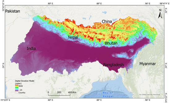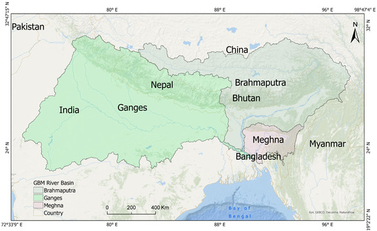 The GBM River Basin is the world’s third-largest river basin after Amazon and Congo river basins [43]. It covers approximately 1.75 million km2 [4], and is home to 630 million people [44]. GBM is a transboundary river basin [44] comprised of India (64%), China (18%), Nepal (9%), Bangladesh (7%), and Bhutan (3%) [20,44]. Nepal and Bhutan are located entirely within the Ganges and Brahmaputra river basins, respectively. Whereas, India and Bangladesh share areas with all three rivers basins, and China is part of only the Ganges and Brahmaputra basins [44] (Figure 1a).