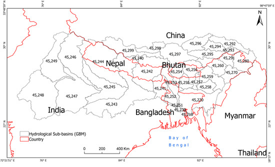 Beck et al. [33] provide one of the most comprehensive global-scale evaluations of satellite precipitation records. They found that the recently developed Multi-Source Weighted-Ensemble Precipitation (MSWEP) [34] was superior in the tropics with the highest agreement between rainfall-simulated and observed river discharge. However, they only compared satellite products over catchments <50,000 km2 due to concerns over spatial averaging in the model. Furthermore, no catchments were analyzed in the GBM due to data limitations. Interestingly, the closest catchment to the GBM, located in southwestern China, showed the Precipitation Estimation from Remotely Sensed Information using Artificial Neural Networks-Climate Data Record (PERSIANN-CDR) [35] as the superior product (see [33] Figure 3). PERSAINN-CDR has had a track record of success in estimating rainfall in South Asia [36,37,38,39,40].