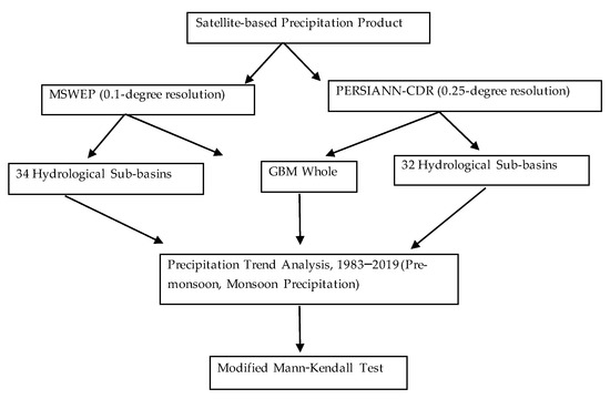 Both MSWEP and PERSIANN-CDR monthly precipitation data were averaged over the pre-monsoon and monsoon seasons for the entire GBM river basin and within 34 pre-defined hydrological sub-basins of the GBM separately. The sub-basin boundaries correspond to the HydroBASIN GIS layer from the World Wildlife Fund [58]. Figure 2 shows the Pfafstetter level-05 sub-basins’ boundaries of the GBM obtained from the World Wildlife Fund (Gland, Switzerland). The Pfafstetter coding system was developed by Otto Pfafstetter in 1989 and is widely used for the description of watersheds or basins. It assigns ID numbers based on the topology of the land surface to describe watersheds as either basin, inter-basin, or internal basin. Pfafstetter level-05 corresponds to inter-basin due to the contribution of additional water to the main stem [59]. Here, the coding number of each sub-basin’s increments from downstream to the upstream, containing 34 hydrological sub-basins. This study only considered 32 pre-defined hydrological sub-basins among the total of 34 when using PERSIANN-CDR. We excluded two smallest sub-basins that were not covered by the 0.25-degree grid resolution of PERSIANN-CDR. Then, the Modified Mann-Kendall test was applied to quantify and compare the trend pattern of the long-term time series of PERSIANN-CDR and MSWEP seasonal precipitation. The ‘modifiedmk’ package was used in R to write the algorithm for the non-parametric modified Mann-Kendall trend test, and ArcGIS Pro 2.8.1 was used to create maps for this study. The methodology is described in Figure 3.