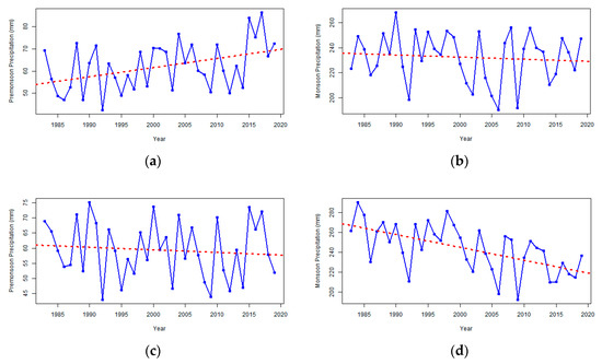 (a) MSWEP pre-monsoon precipitation trend; (b) MSWEP monsoon precipitation trend; (c) PERSIANN-CDR pre-monsoon precipitation trend; (d) PERSIANN-CDR monsoon precipitation trend. The red dotted line indicates the linear regression.