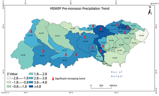 The MSWEP pre-monsoon precipitation had a significant positive trend in 13 sub-basins. In contrast, only four sub-basins had a significant positive trend in PERSIANN-CDR precipitation. Significant positive precipitation trends were mostly found in the central, far north, and western region of the basin as shown in Figure 5a,b. Among the 34 hydrological sub-basins, only six sub-basins in MSWEP showed negative Z-values but none were significant. Meanwhile, for PERSIANN-CDR, 22 hydrological sub-basins showed negative Z-values, and only sub-basin 45,280, situated in the eastern region, showed a significant negative precipitation trend.