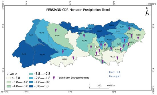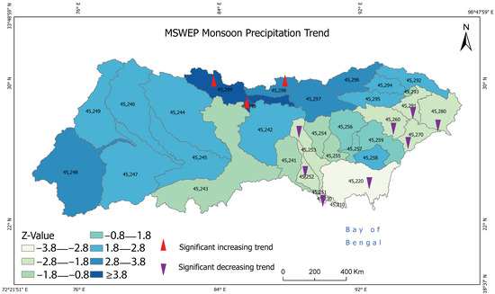 Regarding the monsoon season, eight sub-basins had a significant negative trend for monsoon precipitation in MSWEP (Figure 6a), whereas 19 sub-basins had a significant negative precipitation trend in the PERSIANN-CDR (Figure 6b). The eight MSWEP sub-basins with significant negative precipitation trends were found near Bangladesh and in the eastern region. Similarly, in PERSIANN-CDR, significant negative precipitation trends were mostly found near the southern, central, and eastern part of the GBM (Figure 6b). On the contrary, significant positive precipitation trends were detected in the three sub-basins situated in the upper Himalayas (45,299, 45,298, and 45,240) in MSWEP, whereas, in PERSIANN-CDR, those three sub-basins showed negative Z-values. Only three sub-basins, 45,296 (upper Himalayas), 45,247, and 45,248, situated in the western region, had positive Z-values in PERSIANN-CDR, though they were not significant.