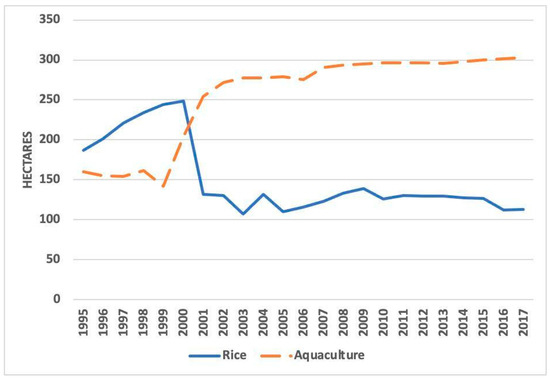 Use of agricultural land in Ca Mau Province, 1995–2017. Notice the sharp pivot between 1999 and 2002 induced by government incentives to shift production from rice to aquaculture (Decree 09/2000/NQ-CP) [20].