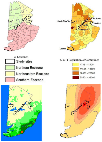 Ca Mau province is bordered by the Gulf of Thailand and the South China Sea. The west and center of the province are lowest in elevation, while the southeast coast has a ridge of higher elevation and a protected mangrove belt. The province includes three broad ecozones [33], as shown in Figure 2a below: (1) The northern eco-zone, with a mixture of forests, rice and aquaculture sites, contains a polder system with freshwater agriculture, and a protected Melaleuca forest; (2) The northeastern eco-zone, characterized by moderate flooding and high salinity (with the exception of a smaller polder system near the city of Ca Mau); and (3) The southern eco-zone, characterized by high salinity but fewer large rivers and less flooding. Soil salinity is a major issue in the northeastern and southern ecozones, with levels reaching a maximum above 25 g/L during the dry season [2]. The soil in Ca Mau is highly saline for most of the year, aside from the autumn wet season [34]. Due to its distance from the Mekong River, less than 1% of the province is at risk of fluvial flooding [34,35]; we therefore did not include this risk in this study.The province’s densest population clusters occur around Ca Mau city and in the west coast city of Song Doc. The southeastern part of the province, with higher salinity rates and a coastal mangrove buffer, is relatively sparsely populated (Figure 2b).