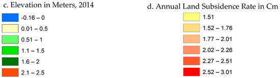 We first digitized the 2015 ICEM compaction-based subsidence rate map for the delta [36] (these values are consistent with the most recent direct measurements [10]). Next, we projected its geographic coordinates to match those of the Topo DEM (see Figure 2d, showing local compaction rates within Ca Mau province; [9]). We then generated the projected 2030 and 2050 elevations for each 500 × 500 land grid of Ca Mau province in the original 2014 TopoDEM base layer by subtracting from it the rasters representing the various scenarios for LS in 2030 and 2050 (see Supplementary Figure S1). These rasters were created using the digitized map (Figure 2d) and the estimated LS values. Estimates for LS for 2030 and 2050 were obtained by starting with 2014 as our baseline year [5] and multiplying the annual compaction rate of each compaction zone (see Figure 2d) by 16 and 36, respectively.