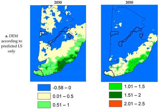 Our findings are largely consistent with Minderhoud et al. [5], as we used the same Topo DEM, but differ in two ways. First, whereas Minderhoud et al., applied projections of 20 cm, 50 cm and 80 cm of SLR across the entire surface of the study area, our study combined global SLR projections with different LS projections based on local compaction rates. Second, as our study was concerned with societal responses, we projected forward by 16 and 36 years to put the estimates onto a timeline.