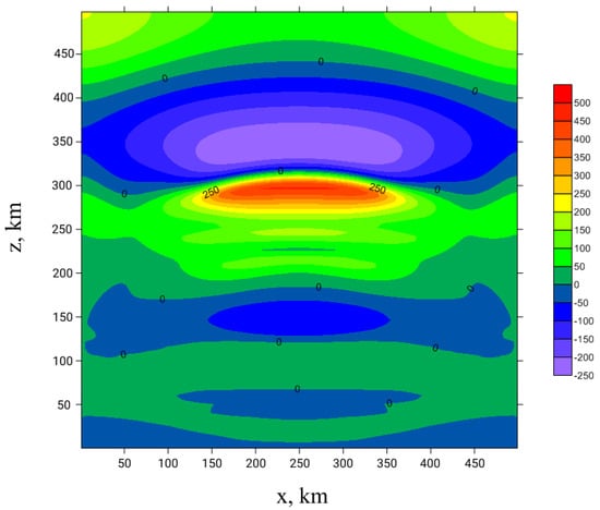 We process the set of numerical experiment data consisting of horizontal coordinate, vertical coordinate, pressure, background pressure, density, background density, temperature, wave perturbation of temperature, wave perturbation of pressure, wave perturbation of density. The mentioned physical values are given as files such that for the fixed horizontal coordinate the vertical coordinate is presented for the range [0, 500] km with the steps that vary with a height from 150 m till 2000 m. Visualization of numerical modelling data is shown in Figure 1. The fixed time and horizontal coordinate seem to be convenient since the one-dimensional theory is considered. Data set was provided to authors by the sources, related to the paper [18]. The model, used in this paper [29], is a numeric solution of the full two-dimensional nonlinear system of hydrothermodynamic balance equations. The program which processes the dataset allows solving the diagnostic Equations (21) and (23) with reasonable accuracy of about a few percents, as estimated by the Runge rule.