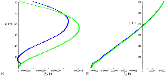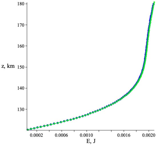 Speaking about the modes extraction at the level of the pressure-entropy vector disturbances field we observe the difference of the results, visible at the plots of the Figure 4. The difference (by module about 5 percents) is due to the significant non-coincidence of the functional parameter . Namely, it is constant, in the case of the model (approximately equal to ), but varies, oscillating from to , being calculated directly from standard atmosphere data , and being differentiated in (10) by means of the conventional derivative approximation. Estimation of , that is, the total energy of all modes at the coordinate range , is given by the following expression