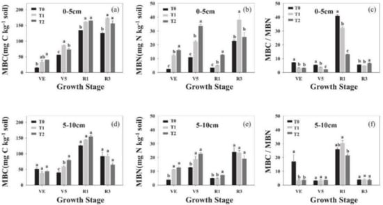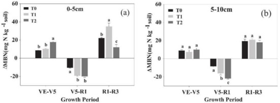In the 0–5 cm layer, residue addition (T1 and T2) had a significant (p < 0.05) positive effect on MBC and MBN contents except for the R3 stage (Figure 1a,b). However, the MBC/MBN ratio significantly decreased in T1 and T2 compared to the control (p < 0.05, Figure 1c). The MBN contents in T2 soils were 30.9%, 50.6% and 153% higher than in T1 at VE, V5, and R1 stages, respectively. In addition, the MBN content was lower while the MBC/MBN was higher at the R1 stage than at the other three stages (Figure 1b,c). Additionally, the MBN fluctuated over the growing stages under different treatments. In the first period (from VE to V5 stage), the highest positive value of ∆MBN was found in T2, and the lowest value was found in T0 (Figure 2). In the second period (from V5 to R1 stage), negative values occurred in all treatments, and the lower negative values of ∆MBN occurred in T1 and T2 compared to T0. The third period (from R1 to R3 stage) had positive values again, and T1 had the greatest positive value of ∆MBN of all three treatments (Figure 2a). The lowest MBN contents of T0, T1 and T2 occurred in the R1 stage and were 3.29, 4.98, and 12.61 mg kg−1, respectively; the highest contents under T0 and T1 were 22.74 and 38.13 mg kg−1 respectively in the R3 stage, while the highest content under T2 was 25.69 mg kg−1 in the V5 stage.