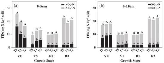 Total inorganic nitrogen (TIN) under three different residue placement treatments (T0, none; T1, surface; T2, incorporated) in 0–5 cm (a) and 5–10 cm (b) soil layers at four growth stages during maize-growing season in the pot experiment. Mean value (n = 4) is shown. Different upper−case letters at the same growth stage indicate statistically significant differences in TIN content at p < 0.05 among treatments, and different lower-case letters at the same growth stage indicate statistically significant differences in NO3− content at p < 0.05 among treatments.