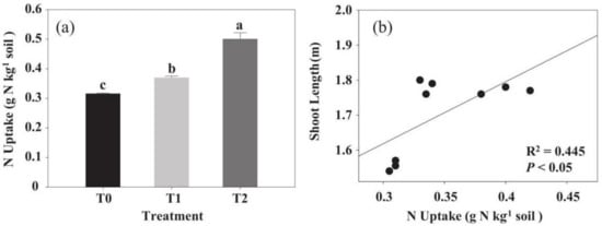 There were significant differences in total N uptake of maize among the three treatments. The total N uptake of maize was 0.32, 0.37 and 0.50 mg kg−1 in T0, T1 and T2, respectively. T1 and T2 exhibited 15.6% and 56.3% higher N uptake (p < 0.05) respectively, than T0 (Figure 5a). Moreover, the regression analysis indicated that the shoot length was significantly and positively correlated with N uptake (Figure 5b).