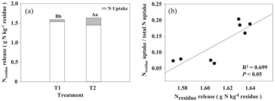 At the end of experiment and in the T1 and T2 treatments, the total residue-derived N release was 1.59 and 1.63 g kg−1 residue, respectively; the residue-derived N uptake was 0.05 and 0.18 g kg−1 residue, respectively (Figure 6a). The amount of N uptake varied greatly with different positions of residue addition; that is, 3.40–11.3% of the total residue-derived N release was taken up by plants. In the T2 treatment, the total N release was 2.70% higher than in T1 (Figure 6a). Moreover, a significant positive relationship was found between the proportion of residue-derived N uptake in the total N uptake by plants and residue-derived N release (Figure 6b).