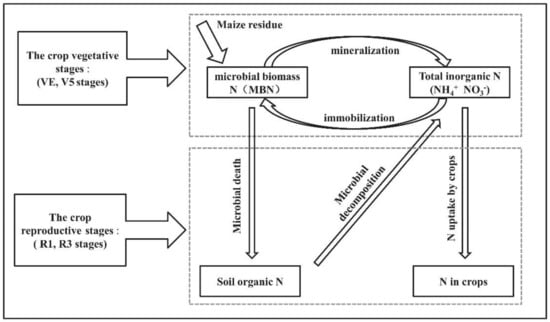 Overall, the present study quantified the mechanism of nitrogen utilization by microbes and crops in different maize growth stages under maize residue retention on the surface and incorporated into the soil (Figure 7). Maize growth can be divided into two stages: the vegetative stage and the reproductive stage. At the vegetative stage, including VE and V5 stages, and because in this study returned residue was the only source of N without fertilizer applied and then microorganisms used N sources to decompose residues. The dead microbes became a new source of organic N in soil, which was mineralized by living microorganisms into inorganic N for re-utilization, which stimulated the second growth of microorganisms [44]. This may explain why residues returned to the soil first lowered mineral N early in the growing season, and then later increased it.