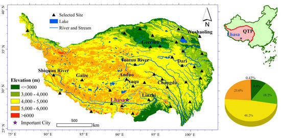 The QTP covers an area of approximately 2.5 × 106 km2 with most elevations being above 4000 m (Figure 1). The vast mountains and widespread alpine lakes that feed most of the major rivers in Asia, together with the distribution of glaciers and permafrost, endow the plateau with one of the most complex terrains and climates in the world [59,60]. The main vegetation types are alpine meadow and steppe [61]. Distinct zonality of soil types exists on the QTP, and the dominant types change from Cambosol in the east to Aridisol in the west [62]. Annual air temperatures vary from −11.2 to 23.5 °C in space, with the coldest and warmest months being January and July, respectively [63]. Permafrost and seasonal frozen soils underlie the major areas of the QTP [64]. Precipitation is inhomogeneously distributed across the QTP, with an annual mean around 120 mm, mostly occurring in summer, especially from June to September, and spatially declining from the southeast to northwest [65]. The QTP’s climate has undergone tremendous change in recent decades [66,67]. Historical observations indicate prominent increasing trends in annual air temperature [68]. Meanwhile, the QTP has become wetter in recent decades, albeit in a rather complicated spatial pattern [69]. Wind speed has generally been decreasing and relative humidity has experienced a decline since the 1970s [70,71]. Air pressure shows an increasing trend on the QTP aligned with increasing surface air temperatures [72].