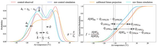 where and are the GCM simulation values for the th month in the projection (denoted by the subscript f) and control (denoted by subscript c) periods (i.e., raw future simulation and raw control simulation), respectively. is the difference between the future simulation and control simulation for the th month. and denote the means of the future and control simulation values respectively. is the total number of monthly values of a certain climatic variable in either period. N equals 180 for a 15-year time window and 360 for a 30-year window. can be approximated as the quotient of the standard deviation of the observation distribution () in the control period over the standard deviation of the raw control simulation () in the same period. As standard deviations are more sensitive to outliers, they can be substituted by and , which are the interquantile ranges on the observation and raw control simulation distributions. Figure 2 illustrates the intuitive meanings of the variables involved in the Q-Q approach given the known distributions of the observations (control observed) and the known simulations in both periods (raw control simulation and raw future simulation). The variable of air temperature is used for example and the percentile pair of 25th and 75th is used as the interquantile range.