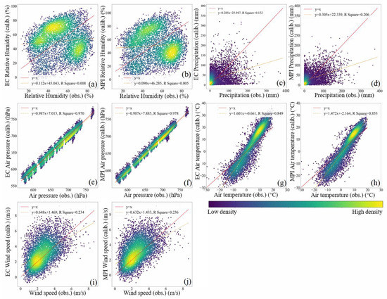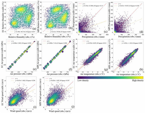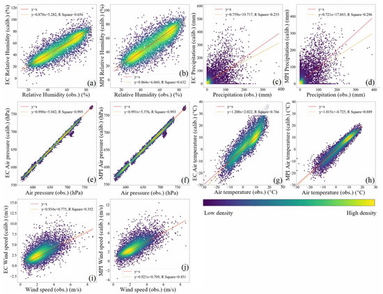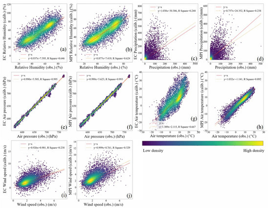 Calibrated results (the ordinates) and corresponding monthly observations (the abscissas) of five major meteorological variables at the 36 QTP sites in the first adjustment (1970–1984 as the control period and 1985–1999 as the projection period). The color ramp in the figure symbolizes the kernel density. The red solid lines represent a 1:1 line. The orange dashed lines represent the linear fitting curves of the samples in the subplots with the R square of each variable marked. Subplots (a,c,e,g,i) show the results from EC-Earth 3 (EC) GCM simulations; and (b,d,f,h,j) the MPI-ESM1.2-HR (MPI) GCM simulations.