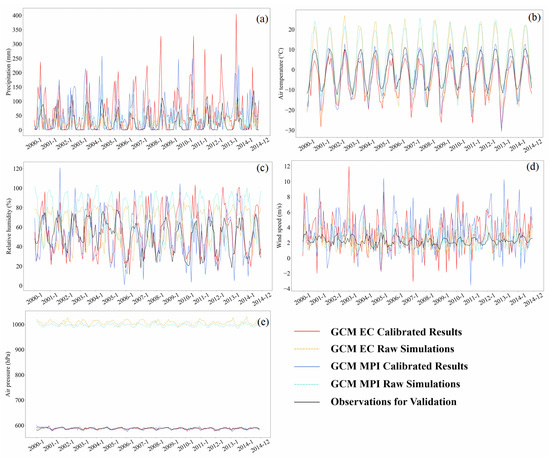 Figure 3 and the metrics still cannot provide a comprehensive view of the behaviors of the adjustment. Therefore, we looked into the calibrated results at a specific site. Figure 4 exhibits the time series of the GCM variables before and after the adjustment at the Naqu site in the 2000–2014 period. Note that three adjustments were made at Naqu using 1955–1969 as the initial control observations. The results for the 2000–2014 period corresponds to the last iteration of the adjustment, with most uncertainties due to error propagation through the three adjustments. The closer the solid lines in Figure 4, the better the performance of adjustment is made for the variable. Similar to the previous findings, the approach’s best performance at this site comes from air pressure. The obviously overestimated raw GCM simulations are satisfactorily corrected to the observation level (Figure 4e). The next comes to air temperature. It is clear that the raw GCM simulations match well with the observations in trend, albeit varying in magnitude. The adjustments succeed in reducing the peaks of the raw GCM simulations down close to the observations. The results based on EC are subject to underestimation and those based on MPI well approach the observations. In the case of relative humidity, the patterns of the two GCMs’ original simulations do not agree with the observations. However, after adjustment, the patterns of the calibrated results became much more synchronized with the observations despite amplitude discrepancies preserved. While the approach works satisfactorily even in the third adjustment for these three variables at Naqu, it fails to work effectively for precipitation and wind speed. The adjustment to precipitation roughly captures major peaks and valleys of the observations, whereas it apparently overestimates the precipitation peaks in summers and wrongly calibrates low precipitation in falls and winters. Relatively poor performance is also seen on wind speed, with large discrepancies throughout the time series, although similar change trends are observed.