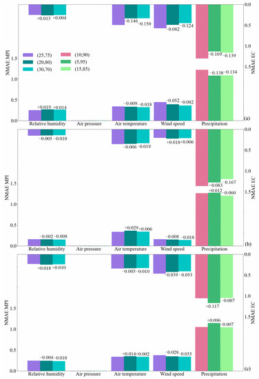 The MAE is an explicit and unambiguous measure of model errors and can best represent the intercomparisons of model performances [92]. To enable cross-variable comparisons, the MAEs are normalized as NMAE [93], as in Equation (13).