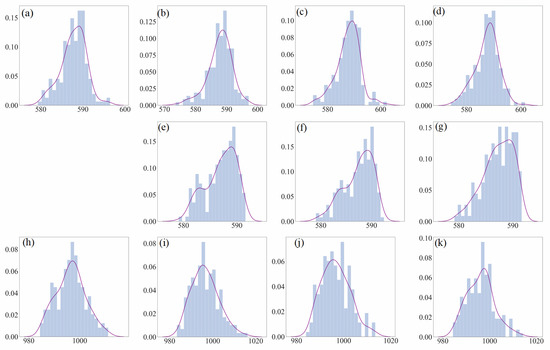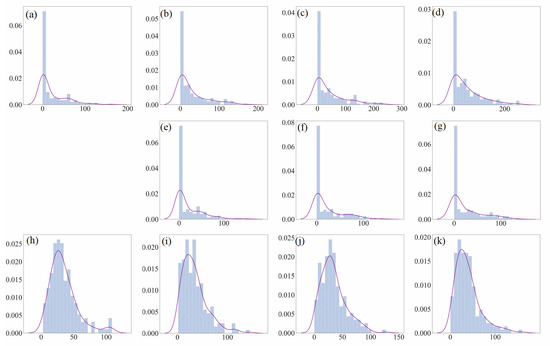Changes in PDF during the successive adjustments of wind speed based on the GCM MPI simulations at the Naqu site. The upper row indicates the control observations ((a), 1955–1969)) and the calibrated results of the three adjustments (b–d). The center row (e–g) indicates the observations for validating the calibrated results for the corresponding projection periods. The bottom row (h–k) indicates the raw GCM simulations in the corresponding periods. The first column: control period (1955–1969); the second to fourth columns: the first (1970–1984), second (1985–1999) and third (2000–2014) adjustments, respectively. The solid line indicates a distribution fit to the data.
