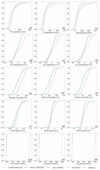 Illustrations of the variables involved in the quantile–quantile (Q-Q) adjustment approach with an example of air temperature on the Naqu site, with the control period being 1970–1984 and projection period being 1985–1999. Left shows the probability density functions (PDF) and the right, the cumulative density functions (CDF). The notations used are consistent with those in Equations (1)–(6). The lines of calibrated future projection represent the results after the adjustment. The vertical straight lines in the PDF subplot represent the means of the observations () and raw simulations () in the control period and the mean of the simulations in the projection period (). The percentile pairs used are the 25th and 75th and their corresponding values are described by and in the CDF subplot. Raw control simulation and raw future simulation data are from the GCM simulations; control observed data are the site observations or the calibrated results produced in the preceding adjustment; and calibrated future projection data are the results desired. The illustrative plot is created by the authors with reference to the concept of Yang et al. [78].