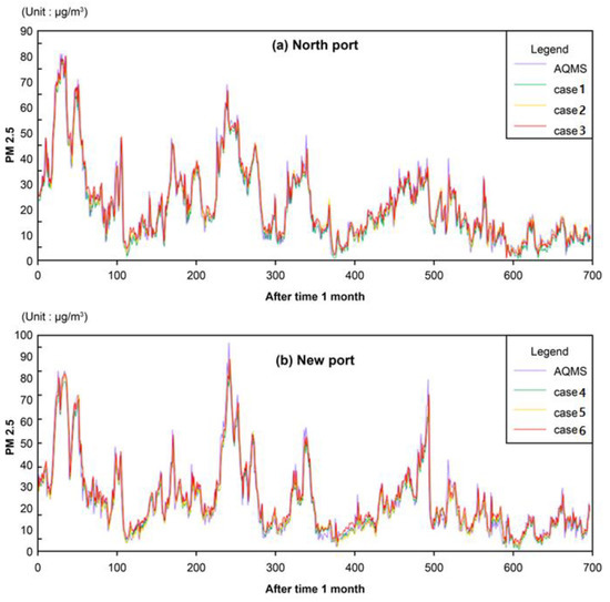 Comparisons between the (a) North Port and (b) New Port RNN-LSTM-predicted and AQMS-observed PM2.5 (Case 1, 4: AQMS + ASOS; Case 2, 5: AQMS + ASOS + all anchored ships; Case 3, 6: AQMS + ASOS + anchored ships over 2000 tons).