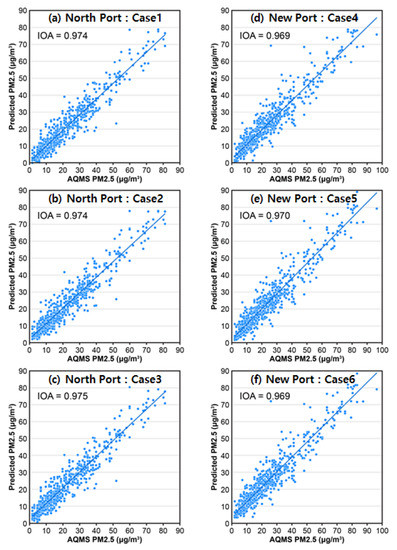 In Case 4, the IOA was 0.635–0.969, the RMSE was 5.87–13.86 µg/m3, the NMB was −5.9–8.2%, and the MNGE was 23.79–76.38%. In Case 5, the IOA was 0.682–0.970, the RMSE was 5.83–13.26 µg/m3, the NMB was −12.5–6.8%, and the MNGE was 24.97–68.68%. In Case 6, the IOA was 0.729–0.970, the RMSE was 5.82–12.72 µg/m3, the NMB was −9.6–8.9%, and the MNGE was 23.67–73.35%. Among Cases 1 to 6, where the PM2.5 concentrations were predicted for Busan New Port, Case 5 showed the IOA with the best prediction performance. In Busan New Port, along with air quality monitoring data and meteorological data, data regarding the hourly berths of ships anchored in Busan New Port were incorporated.