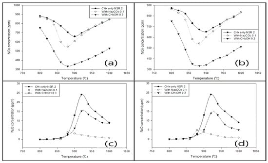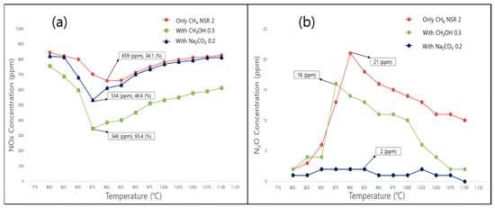 3.3. CH4-SNCR in the Presence of Additives (Na2CO3 and CH3OH)