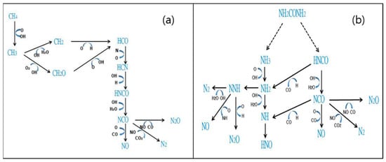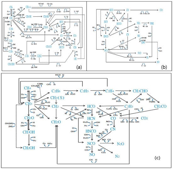 - Glarborg, P.; Miller, J.A.; Ruscic, B.; Klippenstein, S.J. Modeling nitrogen chemistry in combustion. Prog. Energy Combust. Sci. 2018, 67, 31–68. [Google Scholar] [CrossRef] [Green Version]