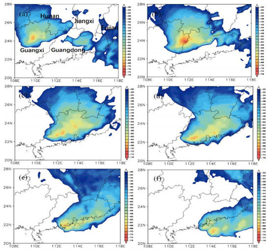 The squall line occurred under the strong vertical wind shear environment. From the perspective of vertical wind shear at low altitude (Figure 4c,d), southeasterly winds prevailed at 950 hPa at low altitude, with southerly winds at 850 hPa and southwesterly winds at 700 hPa. Also, by 14:00 UTC 30 March, the average vertical low level wind shear, which was about 0–3 km in the convection formation region, had reached 19 m/s. As shown in Figure 4, the maximum vertical wind shear at the junction of Guangdong and Guangxi exceeded 24 m−1 at 12:00 UTC 30 March, and the vertical wind shear of the squall line was greater than 18 m−1. The direction of vertical wind shear was southwesterly. By 18:00 UTC, the maximum center of vertical wind shear had increased to 27 m−1 and moved eastwards to Guangdong Province.