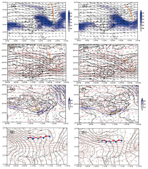 Synoptic-scale atmospheric circulation fields at (a,c,e,g) 12:00 UTC and (b,d,f,h) 18:00 UTC on 31 March 2014, including the (a,b) geopotential height (contours; unit: 10 gpm), and upper-level jet (blue shaded; unit: m/s), trough line (thick brown line) at 200 hPa, (c,d) geopotential height (black contours; unit: 4 gpm), air temperature (red dashed contours; unit: K), trough line (thick brown line), and the western Pacific subtropical high (black contours; unit: 10 gpm) at 500 hPa, (e,f) geopotential height (blue contours; unit: 10 gpm), temperature (red dashed contours; unit: K), water vapor flux divergence (blue shaded areas; unit: kg/(m2 hpa s)), trough line (thick yellow line), and wind field (vectors; unit: m/s) at 850 hPa; (g,h) geopotential height field (black solid line, unit: 1 GPM), temperature (red solid line, unit: °C), wind (vector) stationary front (red blue graphics) at 1000 hPa.