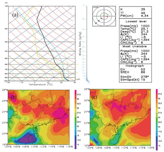 To further study the potential of severe convection, the K index distribution of the simulated area was plotted (Figure 3b,c). It can be seen from the results that the areas of squall line occurrence in South China all had high K index distributions which were above 35 °C. We calculated the K index of the convective region (23°–26° N, 109°–113° E) from 06:00 UTC to 12:00 UTC on 30 March (Figure 3b) and found that the area-average K index was 35 °C. By 18:00 UTC, the K index had risen to 37.5 °C in the region (Figure 3c), showing that the squall line process still had a strong development trend.