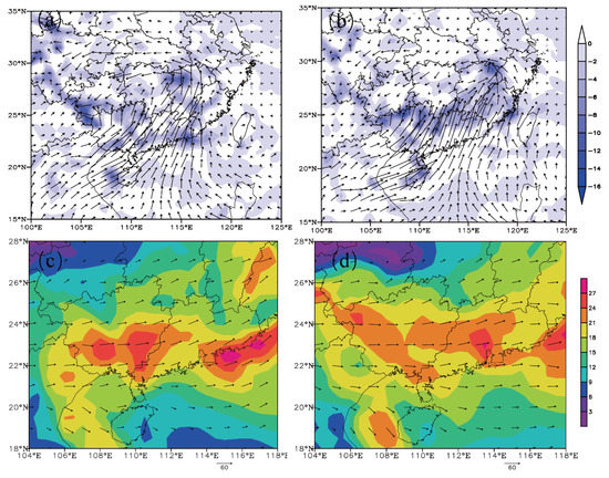Simulated Water vapor flux (vectors; units: g−1 s−1) and water vapor flux divergence at 850 hPa (shaded; units: 10−6 g cm−2 hPa−1 s−1) at 12:00 UTC (a) and 18:00 UTC (b) on 31 March 2014. Panels (c,d) shows the same as (a,b), respectively, but for the vertical wind shear (0–3 km).