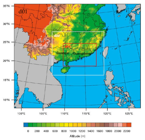 Topography (color-shaded) in the simulation domains (d01, d02 and d03 denote the three one-way nested domains at 13.5 km, 4.5 km, and 1.5 km horizontal resolutions respectively). The locations of Guangdong and Guangxi are marked.