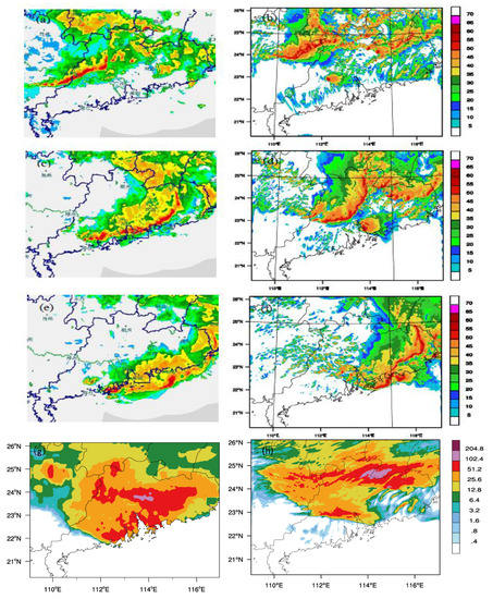 Observed radar reflectivities at 22:00 UTC 30 March 2014 (a), 01:00 UTC 31 March 2014 (c) and 03:00 UTC 31 March 2014 (e), along with the simulated radar reflectivity at 23:00 UTC 30 March 2014 (b), 02:00 UTC 31 March 2014 (d) and 05:00 UTC 31 March 2014 (f) (units: dBZ). Panels (g,h) show the observed and simulated six-hour cumulative precipitation, respectively, during 21:00 UTC–03:00 UTC 30 March 2014.