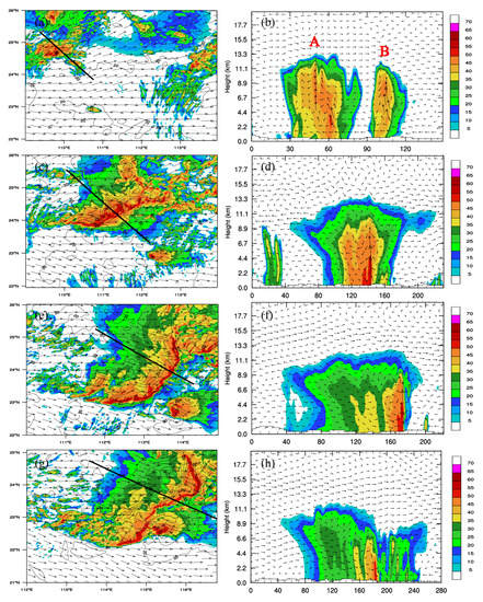The movement and development of the convective system could be clearly seen from the radar reflectivity. In the initial period (Figure 7a,b) the convective system developed in northern Guangxi. Cells B and A continued to develop and eventually merged into the squall line system. During the developing period of the convective system (Figure 7c,d), the squall line had an obvious linear structure, which had moved to the junction of Guangxi and Guangdong. The horizontal scale of the squall line increased significantly. During the maturation of the system (Figure 7e,f), the entire squall line transferred into Guangdong Province. The system had a typical bow reflectivity structure. At this time the trailing stratiform region increased in size compared with that in the developing period. During the period of decline (Figure 7g,h), the bow structure of the system became fractured, dividing into southern and northern parts, the former of which moved over the ocean surface.