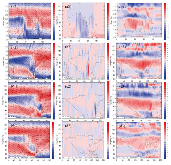 Vertical profile of the horizontal wind field (a1–d1) (units: m s−1), vertical velocity section (a2–d2) (units: m s−1), and perturbation potential temperature (a3–d3) (units: K), at 20:00 UTC 30 March 2014 (a1–3), 23:00 UTC 30 March 2014 (b1–3), 02:00 UTC 31 March 2014 (c1–3), and 05:00 UTC 31 March 2014 (d1–3) (black solid line represents water condensate; units: 0.2 g kg−1). The vertical profile is the same as Figure 7.