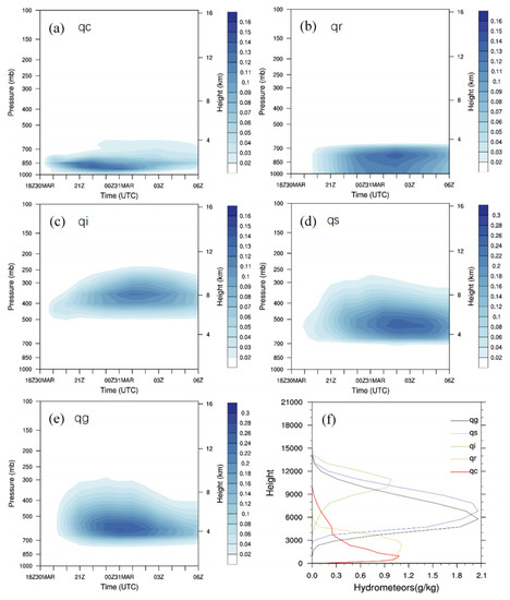 From the vertical distribution of five kinds of water condensation particles (Figure 9), the system was a typical three-layer cloud structure. That is, the ice crystal particles were concentrated in the upper troposphere. Snow particles and graupel particles were mainly distributed in the middle troposphere. In the lower troposphere, cloud water and rainwater were the most abundant. From the time–height evolution diagram of the water condensation, it could be seen that the five kinds of water condensation first increased and then decreased with time, but the time when the maximum value of each water condensation type occurred was different. The cloud water increased rapidly and reached a maximum at 22:00 UTC 30 March, and then began to decrease after entering the maturation period. Several other water condensation particles reached their maximum during the maturation period.