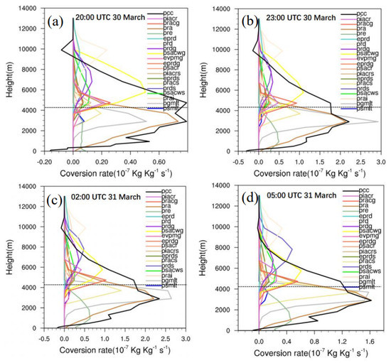 Average conversion rates of microphysical processes at 20:00 UTC 30 March 2014 (a), 23:00 UTC 30 March 2014 (b), 02:00 UTC 31 March 2014 (c), and 05:00 UTC 31 March 2014 (d) (units: 10−7 kg kg−1 s−1). Dotted lines are 0 degrees’ Celsius isotherm lines.