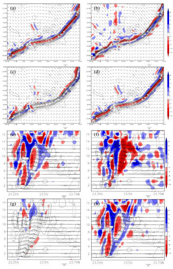 Figure 11e–h shows that the convergence region of the Q vector almost corresponded to ascending motion at all levels. In general, the Q vector played a positive role in the development of the squall line and showed the importance of the adiabatic force.