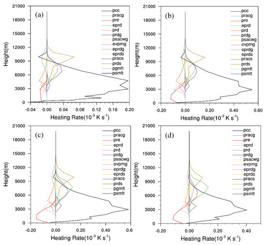 As can be seen from Figure 13, the maximum heating rate and the maximum cooling rate of the microphysical processes both appeared in the stratiform region within the system. Water vapor condensation to cloud water (PCC+) and the evaporation of cloud water (PCC−) extended from the bottom layer to the middle and high layer to 9 km. The maximum heating rate of water vapor condensing into cloud water (PCC+) corresponded to the strong updraft area. The deposition of water vapor into ice crystals (PRD) was concentrated near the upper troposphere at 10.5 km. The maximum cooling rate of rainwater evaporation (PRE), which was the main cooling process, was concentrated in the middle and lower troposphere, corresponding to the strong downdraft at the lower layer (Figure 13b).