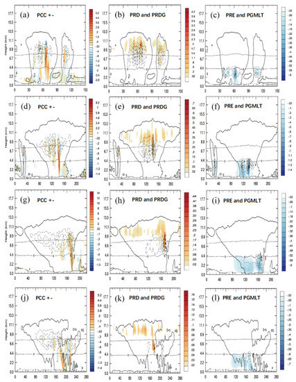 Vertical profile of microphysical latent heat of phase change at 20:00 UTC 30 March 2014 (a–c), 23:00 UTC 30 March 2014 (d–f), 02:00 UTC 31 March 2014 (d–f), and 05:00 UTC 31 March 2014 (g–i), for (a,d,g,j) water vapor condensation to cloud water (PCC+) (red), cloud water evaporation (PCC−) (blue), water vapor sublimation to snow (PRDS; interval: 0.04 × 10−2 K s−1) (dotted isolines); (b,e,h,k) water vapor sublimation to ice crystals (PRD) (red), water vapor sublimation to graupel (PRDG; interval 0.06 × 10−2 K s−1) (dotted isolines); and (c,f,i,l) rainwater evaporation (PRE) (blue), graupel melting to rain (PGMLT; interval: 0.06 × 10−2 K s−1) (dotted isolines). The thick black solid line is the 0.02 g kg−1 water condensation line; the above and below thin black solid lines are the 0 °C and −20 °C isotherm separately, respectively (units: 10−2 K s−1).