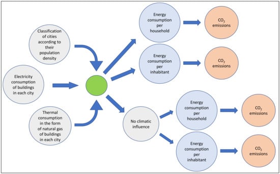 First, the cities that are within the area of interest are defined. Next, the number of inhabitants of them and the extension that they occupy are identified. This point is very important because it is necessary to consider the area actually occupied by the city, not the entire extension that the municipality can occupy. This is so because the extension of the municipality is normally much greater than that of the city. Next, the electrical and thermal consumption per inhabitant and household are found. From these consumptions, CO2 emissions are calculated. To eliminate the influence of the climate, the electrical and thermal consumptions of the buildings are found. Finally, the emissions without the influence of the climate are calculated. A flowchart of the proposed method is shown in Figure 1.