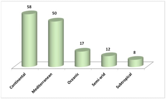 The climate that affects each of the cities was identified. Table 1 also shows the type of climate with which each one was affected: (C) continental, (M) Mediterranean, (O) oceanic, (A) semi-arid, and (S) subtropical. The number of cities affected by each type of climate is shown in Figure 2. The largest number of cities was in the continental zone, followed by the Mediterranean zone. These two areas were the most numerous, reaching 75% of the cities. The cities located in the other areas were only 25%.