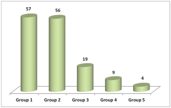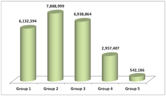 The main statistical data are presented in Table 3. The five groups defined in Section 4.1 were maintained. Figure 8 shows the mean consumption values for each group, as well as the average values for a group containing all cities. The total consumption of each group of cities increased as their density increased. Only the cities of Group 1 had a consumption lower than the average value, this being almost 10% lower. Those with the highest consumption, Group 5, exceeded mean consumption by almost 25%. In addition, while between Groups 2 to 4 there was an approximately homogeneous increase, between Groups 1 and 2 and between Groups 4 and 5, the growth was high.