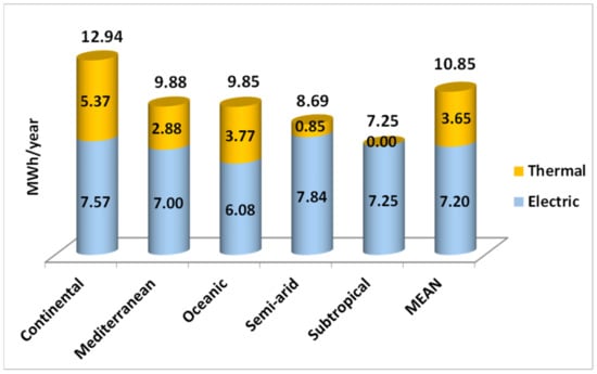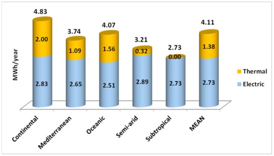 The information on energy consumption according to the climate was used again. Figure 10 shows the total, electricity, and thermal consumption per inhabitant according to the type of climate that affects the city []. With this information, the influence of climate can be eliminated and study how density affects energy consumption without that influence.