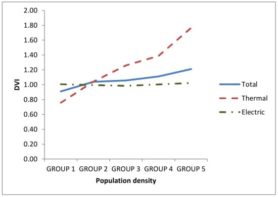 To analyze the difference more clearly in energy consumption between the groups, the index defined in Equation (7) was used. Figure 9 shows these variations. The total consumption of Groups 2, 3, and 4 were similar, while in Groups 1 and 5, a greater difference was detected. Thermal consumption follows a clearly ascending line as density increases in cities. Thus, while Group 1 had a consumption lower than 20% of the average value, Group 5 almost reached a consumption that was 80% higher. Furthermore, electricity consumption was scarcely influenced by density in cities.