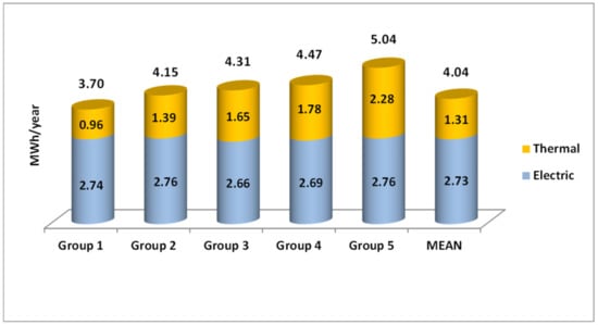 Regarding electricity consumption, the behavior is completely different. In this case, electricity consumption was almost constant, varying only 1% between extreme values. However, the greatest difference occurred between the cities of Group 5 and the rest since the difference was minimal among the rest of the groups.