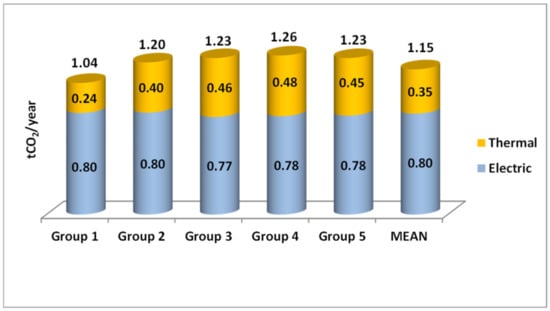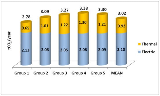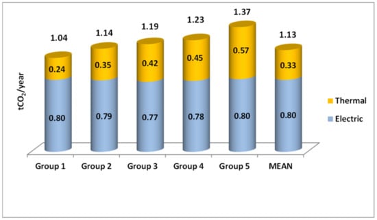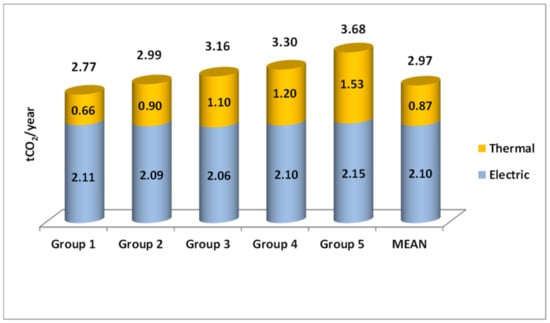 Regarding the proportion of the type of emissions in each group, those of electrical origin was higher than the thermal ones. Furthermore, as population density increased, the percentage of electricity emissions decreased. Thus, from 74% of Group 1, it goes to 55% of Group 5.